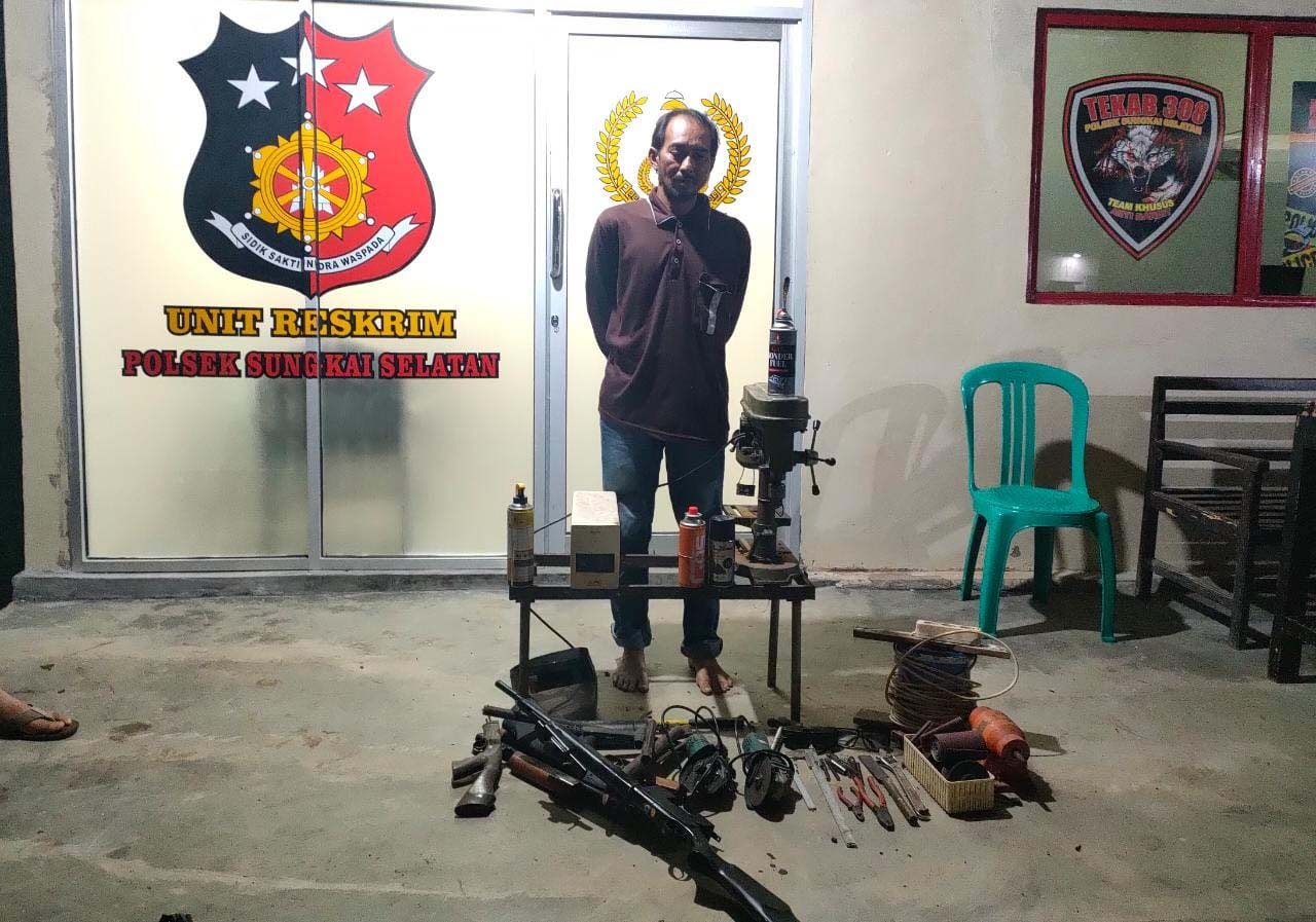 Selain itu terdapat juga barang / peralatan yang diduga untuk membuat senpi berupa 1 unit bor duduk (listrik), 2 unit gerenda, 2 tabung gas, 1 gulungan kabel, 1 kaleng cat Pilok, 1 Hel Las, 2 kaca mata Las, 13 mata gerenda dan beberapa barang lainnya, sehingga pelaku lansung kita amankan ke Mapolsek.