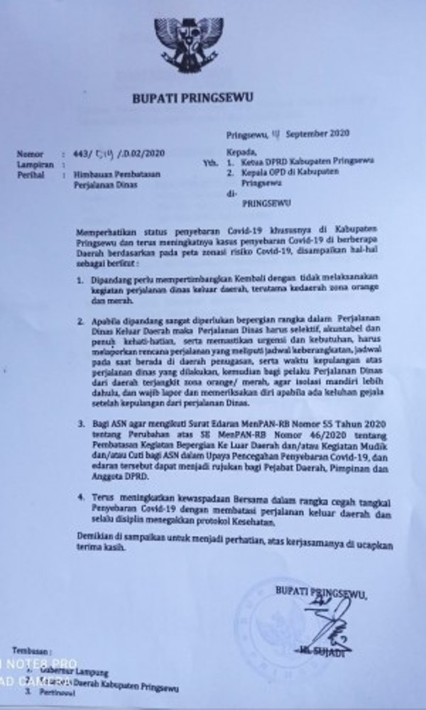 Dalam surat edaran Bupati Pringsewu yang ditanda tangani Bupati Pringsewu tertanggal 10 September pada poin 1 menyebutkan dipandang perlu mempertimbangkan kembali dengan tidak melaksanakan kegiatan perjalanan Dinas keluar daerah,terutama ke zona oranye dan merah.