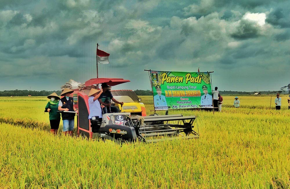 Lampung Timur, etalaseinfo (SMSI) Bupati Lampung Timur Dawam Raharjo pada kegiatan akhir pekan hari Minggu (14/11/2021) melakukan panen raya padi di Desa Matarambaru, Kecamatan Matarambaru Lampung Timur. Wilayah Matarambaru juga merupakan salah satu daerah penghasil padi di Kabupaten Lampung Timur. Pada tahun 2021 ini para petani di Kecamatan Mataram baru merasa bersyukur tanaman padi mereka terbebas dari bencana banjir.