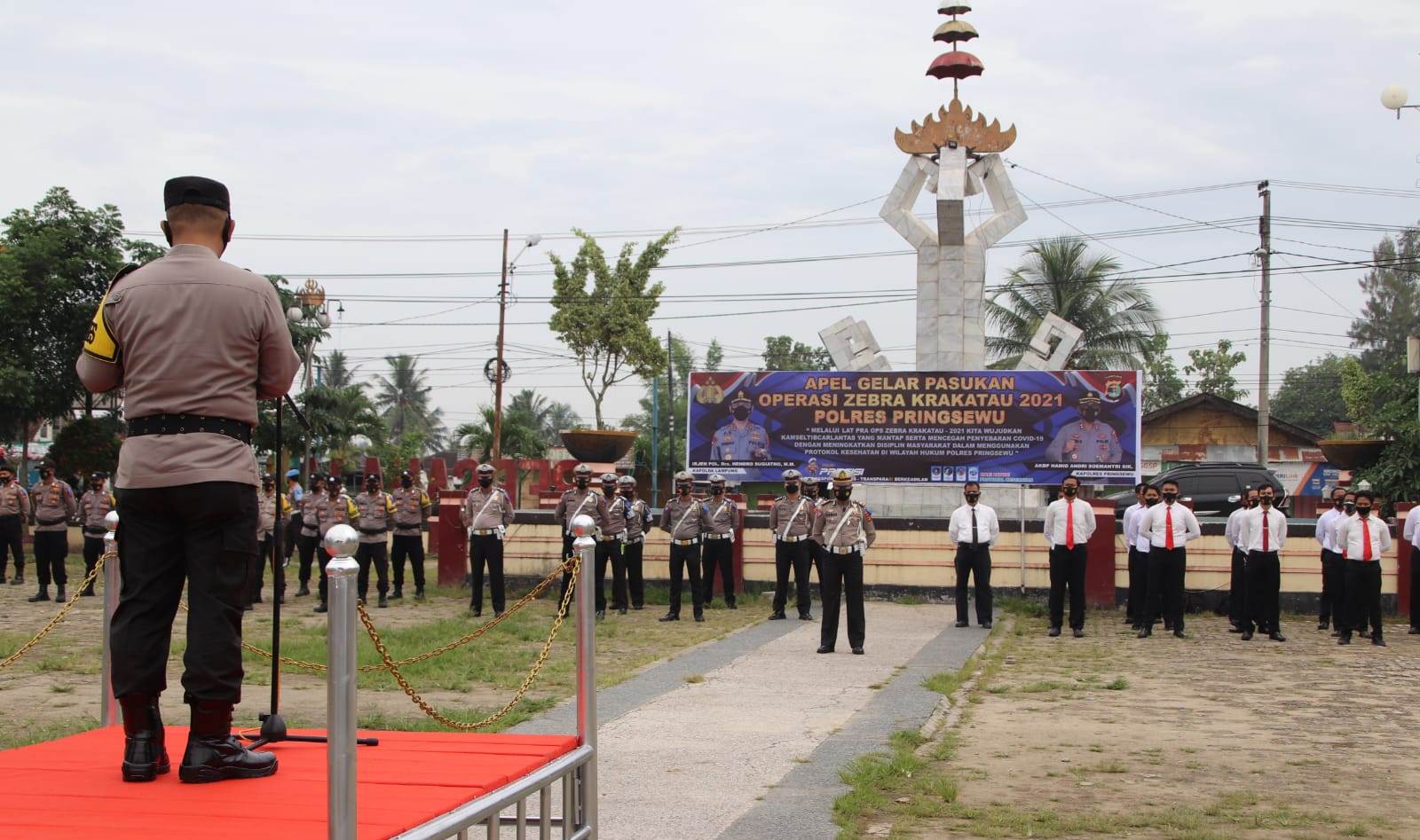 Kapolres Pringsewu saat membacakan amanat Kapolda Lampung mengatakan Operasi zebra Krakatau 2021 difokuskan pada upaya preemtif dan preventif guna mensukseskan kegiatan vaksinasi dan edukasi protokol kesehatan dalam upaya melawan pandemi Covid-19.