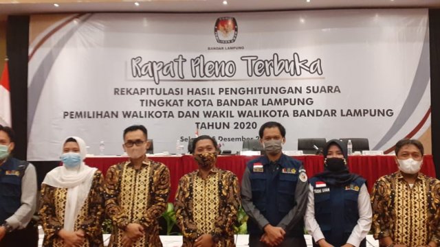 Rapat pleno terbuka rekapitulasi penghitungan suara hasil pemilihan kepala daerah (Pilkada) Kota Bandar Lampung digelar KPU Kota Bandar Lampung di Hotel Emersia, Selasa (15/12/2020). Dari hasil pleno tersebut, pasangan calon nomor urut 3 Eva Dwiana-Deddy Amarullah, unggul dalam pelaksanaan pemilihan kepala daerah (Pilkada) Bandar Lampung.
