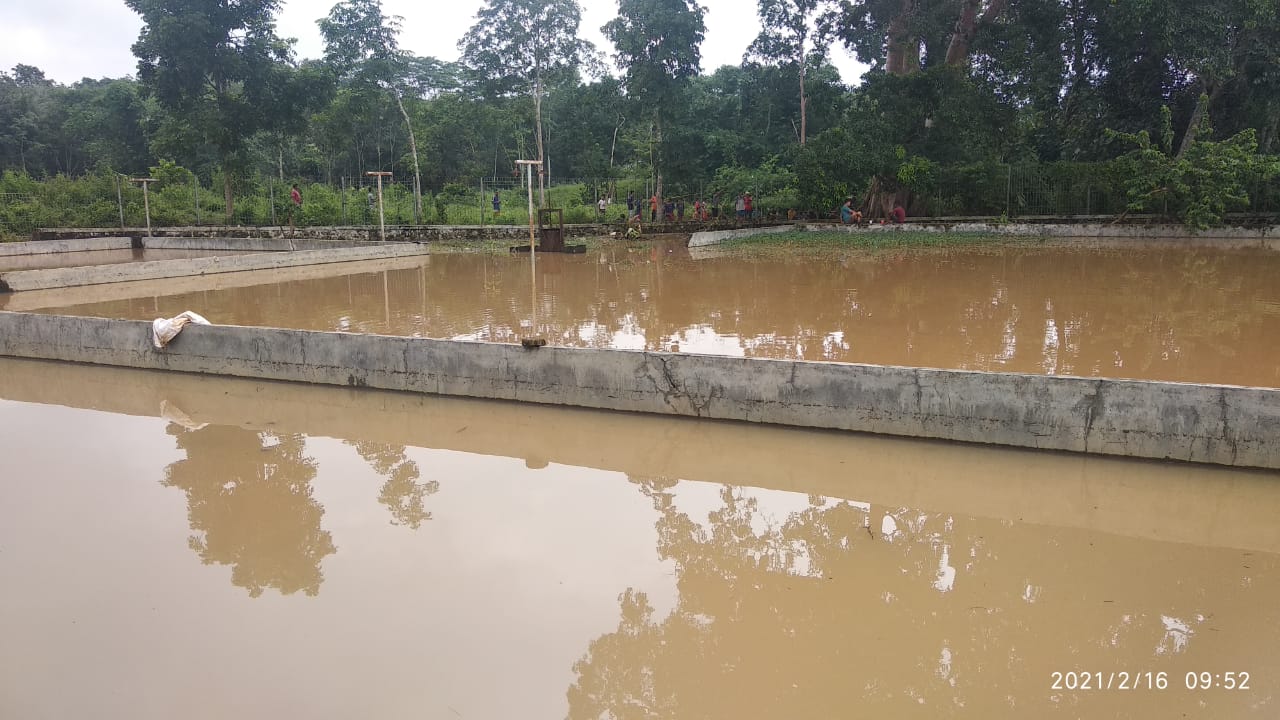 Balai kolam pembenihan ikan yang berada di wilayah Kebun Lima, Kelurahan Tanjung Senang, Kecamatan Kotabumi Selatan, Lampung Utara, air meluap hingga setinggi lutut orang dewasa.