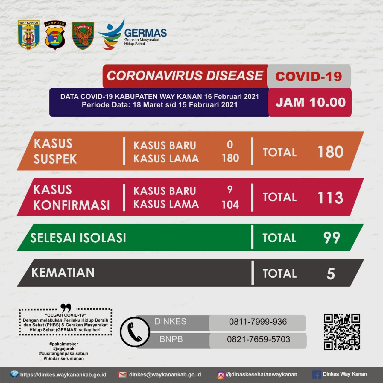 Way Kanan, etalaseinfo.com (SMSI) – Kepala Dinas Kesehatan Kabupaten Way Kanan, Anang Risgiyanto, S.KM., M.Kes, yang juga juru bicara gugus tugas percepatan penanggulangan Covid-19 menyampaikan adanya penambahan 9  kasus terkonfirmasi Covid-19 asal way kanan dan 5 orang pasien telah dinyatakan selesai isolasi, selasa (16/02/2021)