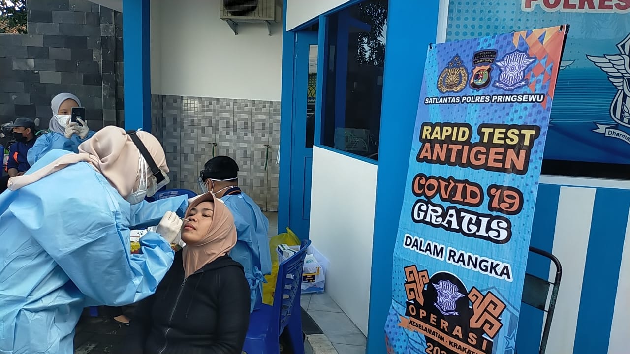 Pringsewu, etalaseinfo.com (SMSI) – Dalam rangka operasi keselamatan Krakatau 2021 Satuan Lalu Lintas Polres Pringsewu bekerjasama dengan dinas kesehatan kabupaten Pringsewu menggelar rapid test antigen secara gratis di jalan lintas Barat depan Pos lalu lintas Pagelaran Kecamatan Pagelaran Kabupaten Pringsewu. Jumat (16/4/2).
