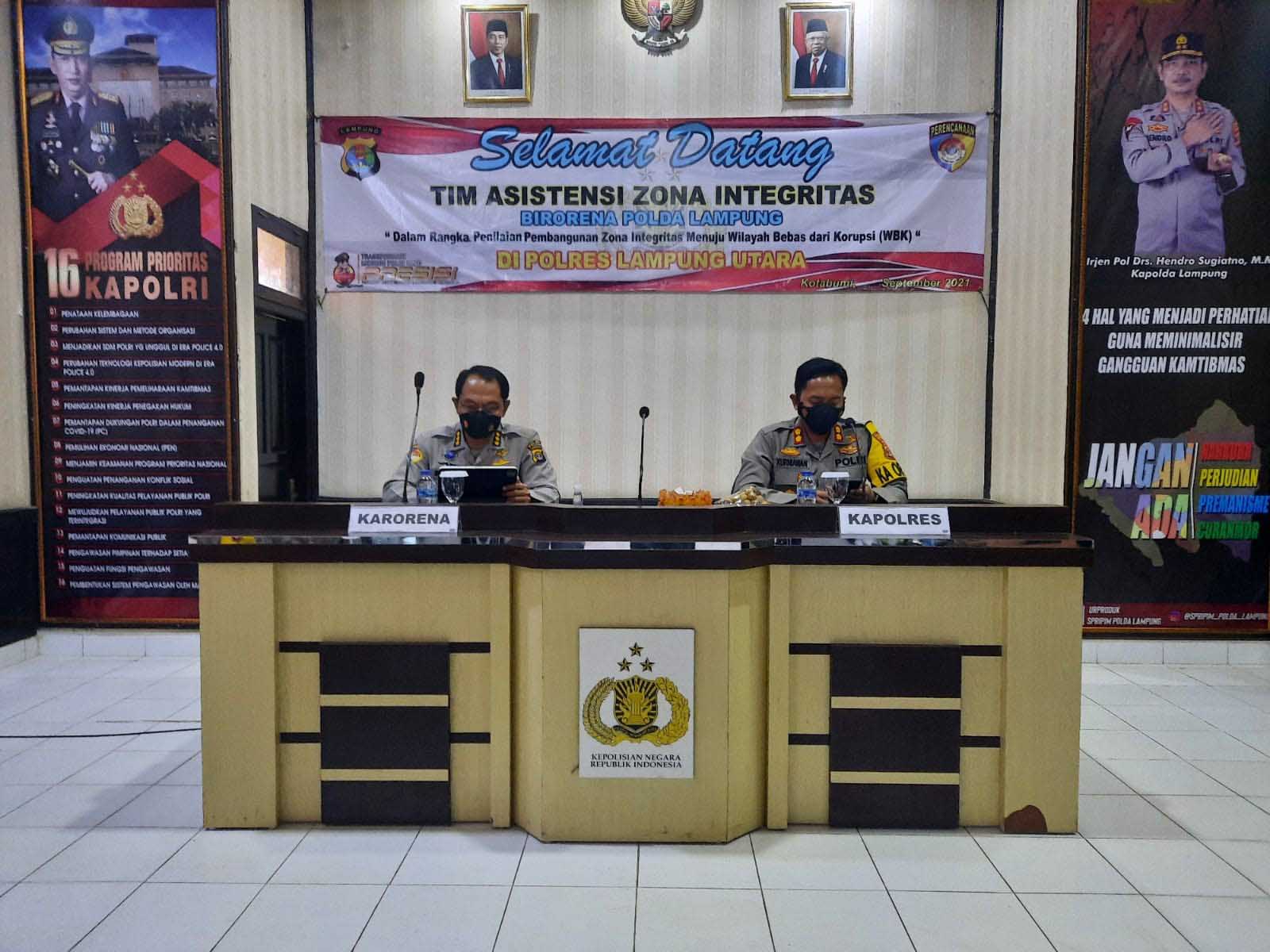 Lampung Utara, etalaseinfo (SMSI) – Tim Asistensi Zona Integritas Birorena Polda Lampung Kunjungi Polres Lampung Utara dalam rangka penilaian Pembangunan Zona Integritas Menuju Wilayah Bebas Dari Korupsi (WBK) di Polres setempat, Kamis (16/9/2021).