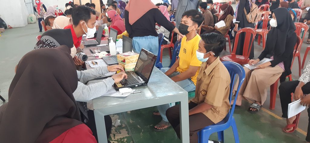 Kalianda, etalaseinfo (SMSI) – Para pelajar dari SMP Negeri Satu Atap 1 Kalianda, antusias mengikuti vaksinasi massal yang digelar Pemerintah Kabupaten (Pemkab) Lampung Selatan di Gedung Olahraga Way Handak (GWH) Kalianda, Sabtu (16/10/2021).