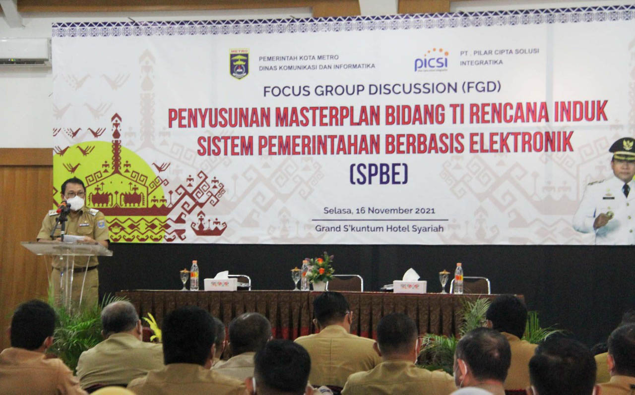 Metro, etalaseinfo (SMSI) –  Walikota Metro menghadiri sekaligus membuka Focus Group Discussion (FGD) terkait Penyusunan Masterplan Bidang IT Rencana Induk Sistem Pemerintahan Berbasiskan Elektronik (SPBE) Kota Metro.