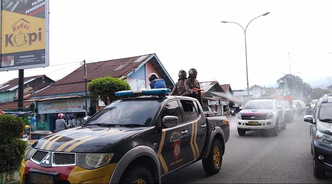 Dalam kegiatan ini, Polres Tanggamus menggandeng Dinas Kesehatan dan Damkar Tanggamus dengan menerjunkan kendaraan patroli Sat Sabhara dan Sat Lantas berisi 2000 liter disinfektan.