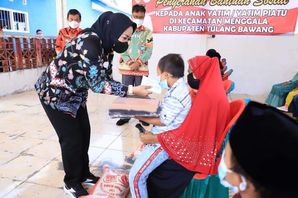 Tulang Bawang, etalaseinfo (SMSI) – Serangkaian kegiatan Bupati Tulang Bawang, Dr. Hj. Winarti, S.E., M.H menyerahkan Bantuan Sosial kepada masing-masing 25 Anak Yatim dan Yatim Piatu di Kecamatan Penawartama, Gedung Aji Baru, Menggala, Penawar Tama, dan Gedung Meneng sebagai wujud kepedulian Bupati kepada masyarakat Kabupaten Tulang Bawang. 16-9-2021.
