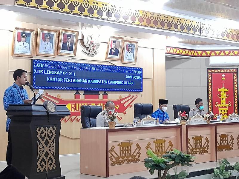 Bupati Lampung Utara, H. Budi Utomo, SE., M.,M., menghadiri Pencanangan Pembangunan Zona Integritas Kantor Pertanahan Kabupaten Lampung Utara dan Sosialisasi Pendaftaran Tanah Sistematis Lengkap tahun 2021 di Aula Tapis Pemda setempat. Kamis (17/12/2020).