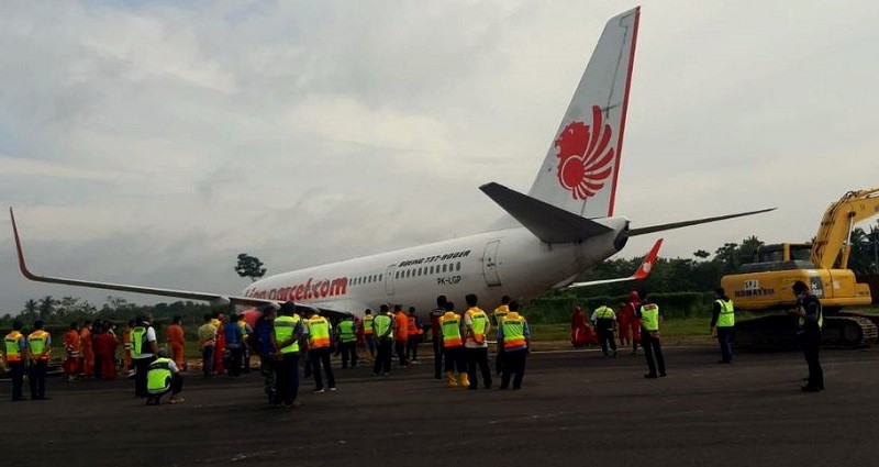 Pesawat Lion Air dengan rute penerbangan Batam-Lampung tergelincir keluar landasan pacu Bandara Radin Inten II akibat cuaca buruk, Minggu (20/12/2020) pukul 14.45 WIB. Tidak ada korban jiwa dalam insiden itu dan pesawat dapat ditarik ke apron. (Andi)