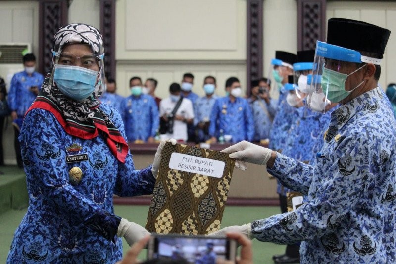 Bandarlampung- Sekda Kabupaten Pesisir Barat N Lingga Kusuma menerima SK sebagai Pelaksana Harian (Plh) Bupati Pesisir Barat dari Gubernur Lampung yang diwakili oleh Wakil Gubernur Lampung secara bersamaan dengan Sekretaris Daerah/Kota lainnya.