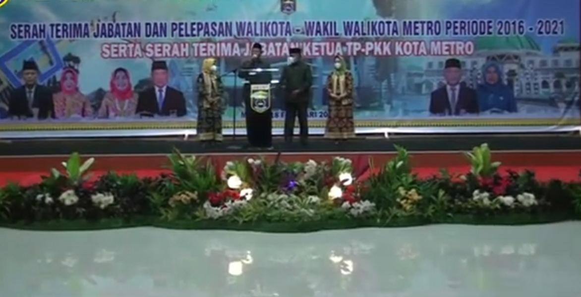 Metro, etalaseinfo.com (SMSI) – Pemerintah Kota Metro gelar Serah Terima Jabatan (Sertijab) dan pelepasan Walikota dan Wakil Walikota Metro periode 2016-2021 serta Serah Terima Jabatan TP-PKK Kota Metro, di Gedung Sessat Agung Bumi Sai Wawai (GSABSW) Kota Metro, (18/02/2021).