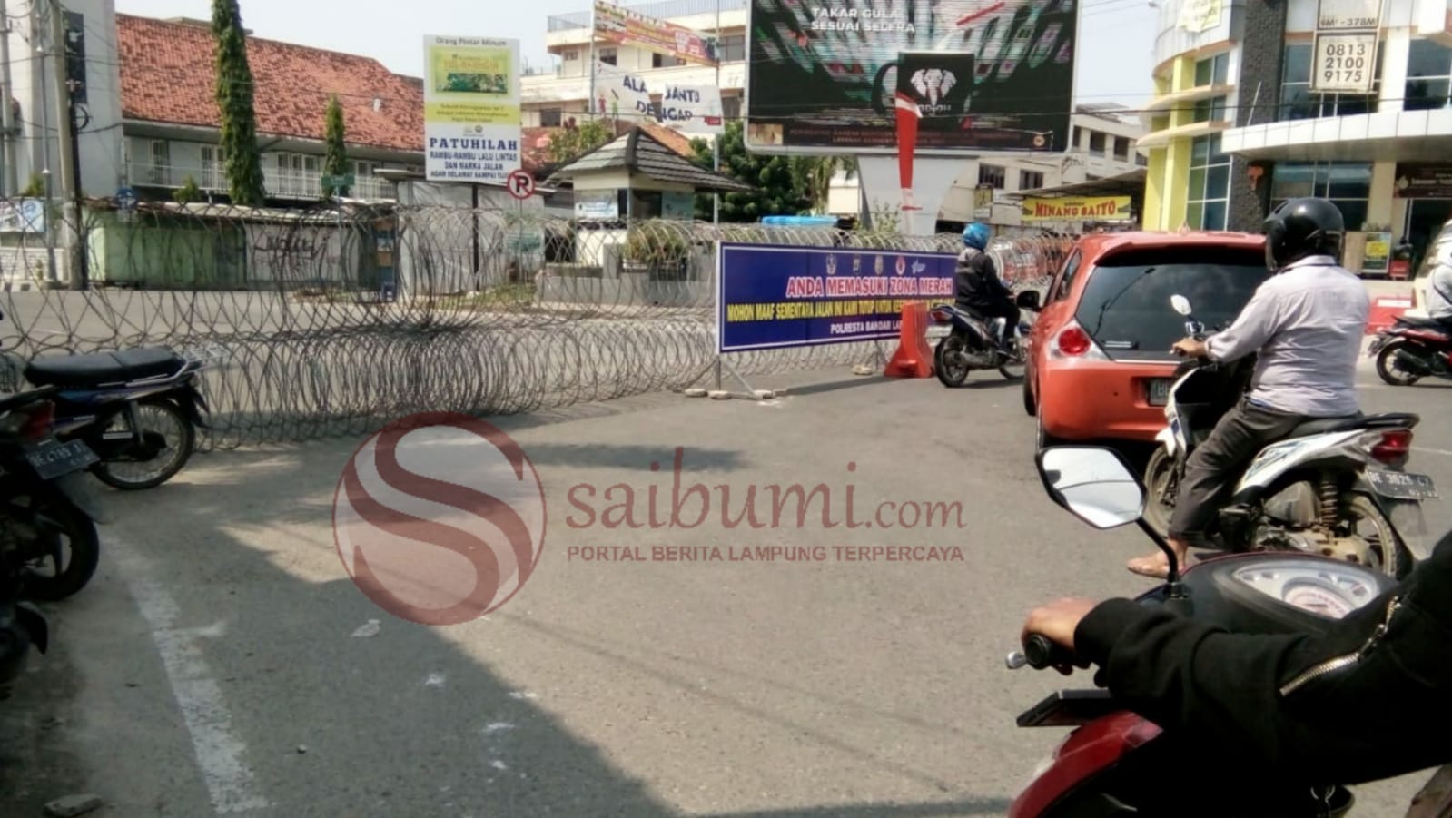Saibumi.com (SMSI), Bandar Lampung – Pos penyekatan Jalan Raden Intan tepatnya di depan Plaza Pos, Kota Bandarlampung terpantau disekat menggunakan kawat berduri. Rabu (18/8/2021)