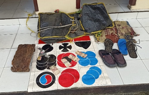 Dari lokasi kejadian, Petugas berhasil menyita barang bukti berupa Lapak Judi Dadu Koprok, Uang Tunai Puluhan Ribu Rupiah, Sepatu dan Sandal, Kantung Karung, serta Bangku Kayu. (Eko Arif)