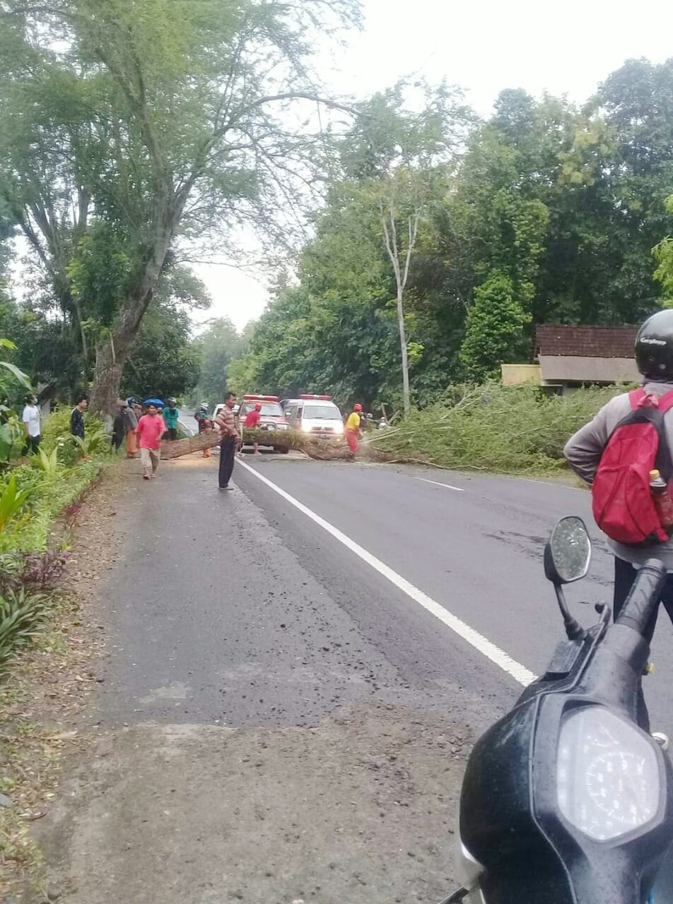 Kronologi kejadian semula Damar Arimbogo Nugroho 20 tahun warga Dayakan Pengasih Kulon Progo putra Almarhum Dalang Ki Gebes pengendara sepeda motor Honda Vario dengan nomor polisi AB 3340 OC melaju dari arah barat atau Pengasih hendak ke timur arah Sentolo saat bersamaan pohon asem tumbang dan ranting mengenai pengendara sehingga terjatuh.