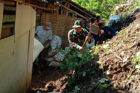” Untuk itu, kami bersama perangkat desa setempat melaksanakan karya bakti, guna mengantisipasi longsoran tanah susulan,” ungkap Koptu Haryanto.
