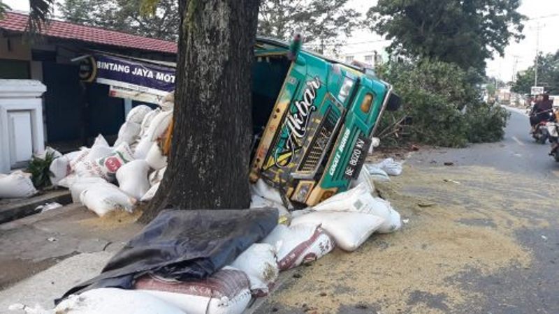 Sopir truk Eko (40) menjelaskan, dirinya hendak mengirimkan gabah dari Way Abung menuju pabrik di Kelurahan Karangrejo Metro Utara dan terguling akibat menghindari seekor kucing yang melintas.
