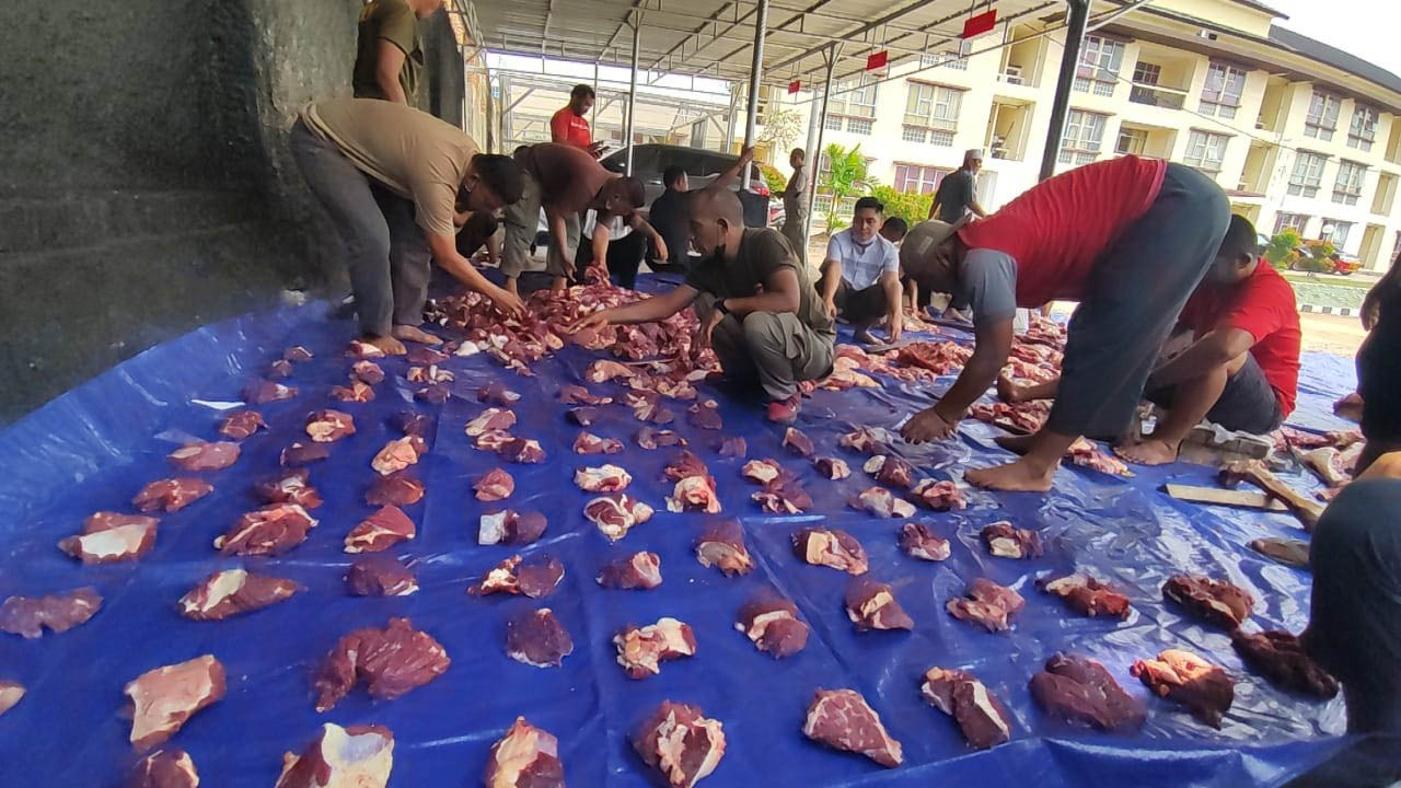 Tahun ini 2 ekor sapi dan 1 kambing yang di Qurbankan. Seusai penyembelihan hewan kurban, daging-daging tersebut dibagikan kepada masyarakat dan dilingkungan Asrama Brimob Rawa Laut.
