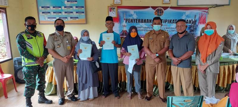 Kepala BPN Lampura Eko Hadi Kuncoro beserta tim, Kades Sidokayo Agus Saprudin beserta perangkat Dess Babinsa Zerda Aan Supriyanto Dan warga sebanyak 165 orang yang akan menerima Sertifikat secara simbolis melalui Program Pendaftaran tanah Sistematis Lengkap (PTSL)