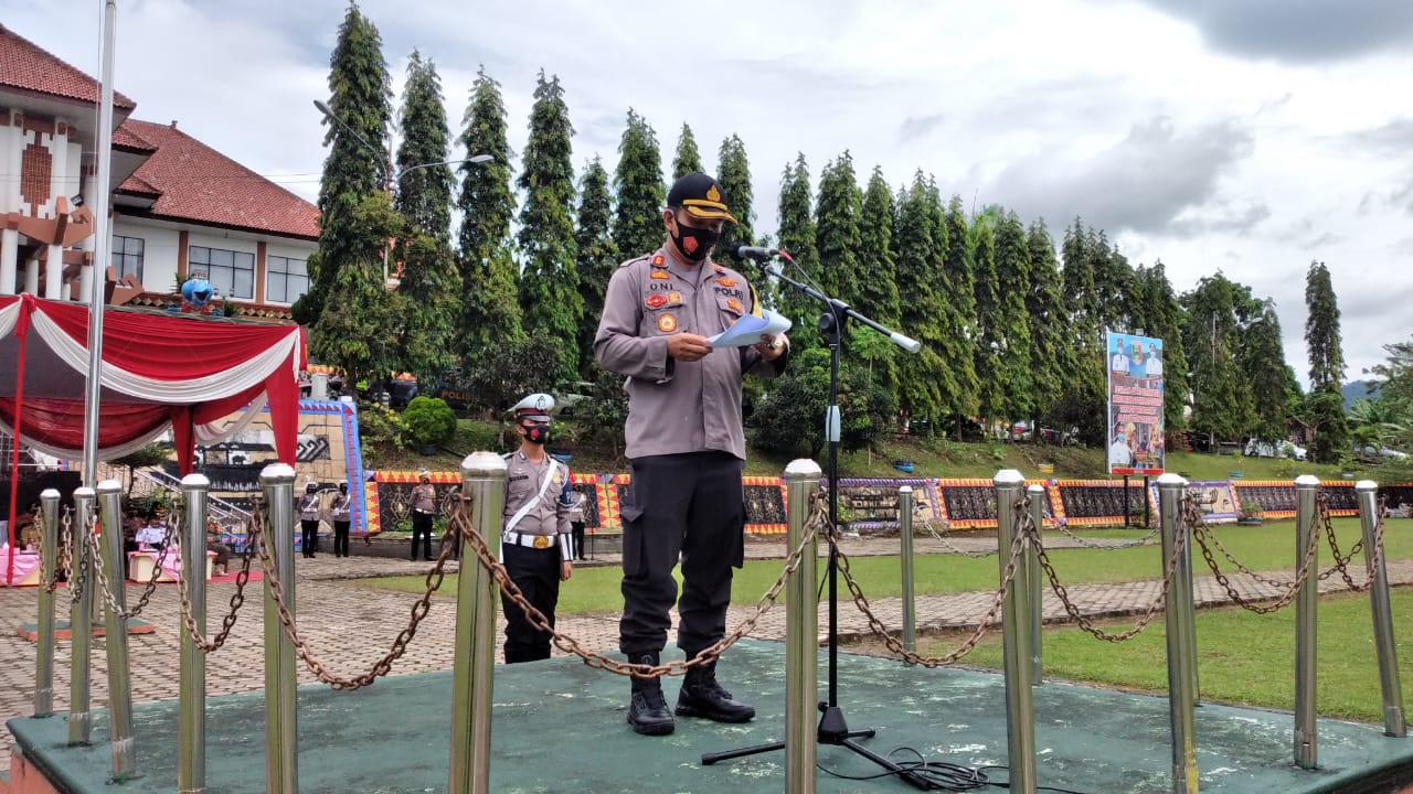 Dalam amanatnya, Kapolres AKBP Oni Prasetya mengatakan, Polri menyelenggarakan operasi terpusat yakni Operasi Lilin 2020 yang akan dilaksanakan selama 15 hari, mulai dari tanggal 21 Desember 2020 s/d 04 Januari 2021, dengan mengedepankan kegiatan preemtif dan preventif secara humanis, serta penegakan hukum secara tegas dan profesional, dengan tetap menerapkan protokol kesehatan guna mencegah penyebaran Covid- 19, sehingga masyarakat dapat merayakan Natal dan Tahun Baru dengan rasa aman dan nyaman.
