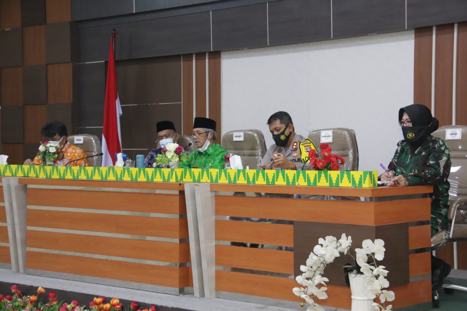 Rapat dengan protokol kesehatan yang dipimpin Sekdakab Pringsewu Drs.H.Heri Iswahyudi, M.Ag. ini dihadiri Bupati Pringsewu H.Sujadi dan Wakil Bupati Pringsewu Dr.H.Fauzi, SE, M.Kom., Akt., CA, CMA, Kapolres Pringsewu AKBP Hamid Andri Soemantri, S.IK., Pabung Pringsewu Mayor CPM Eva Yuniar Kamal, Kakan Kemenag Pringsewu H.Ahmad Rifa’i,  SE, MM beserta instansi vertikal lainnya, jajaran pemerintah daerah beserta para camat se Kabupaten Pringsewu.