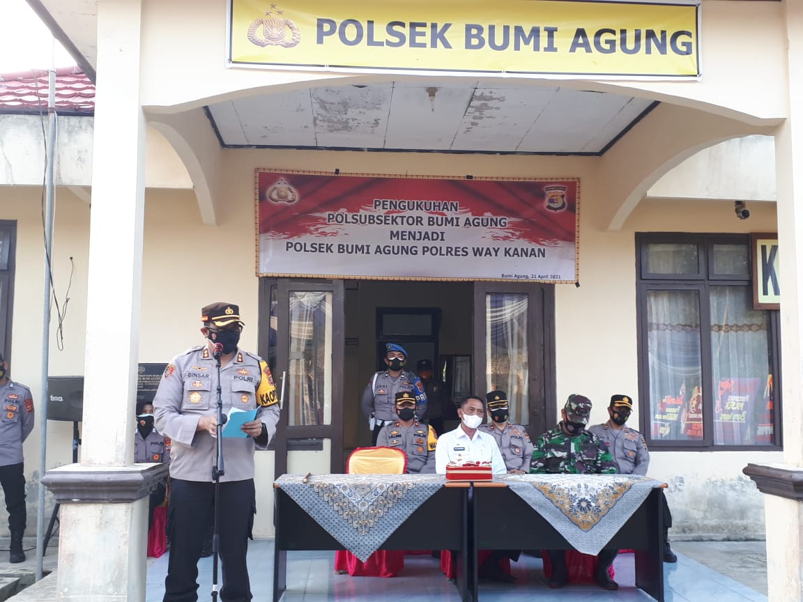 Way Kanan, etalaseinfo.com (SMSI) – Kapolres Way Kanan secara resmi mengukuhkan Polsek Bumi Agung, di Kecamatan Bumi Agung Kabupaten Way Kanan. Rabu (21/4/2021).