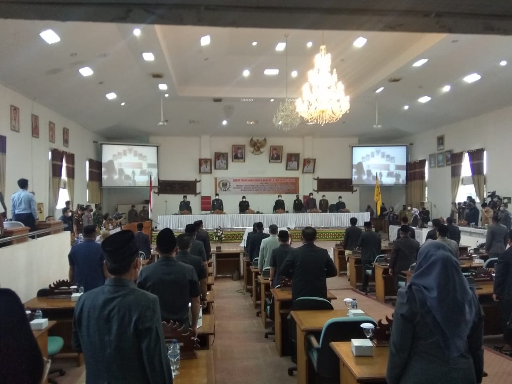 Sidang paripurna di laksanakan hari Senin 21 Juni 2020 di aula gedung DPRD setempat dengan di hadiri sedikitnya 45 anggota DPRD dari 50 anggota yang ada, jajaran porkopinda,kepala kantor dinas dan camat sekampung tengah. (Din)