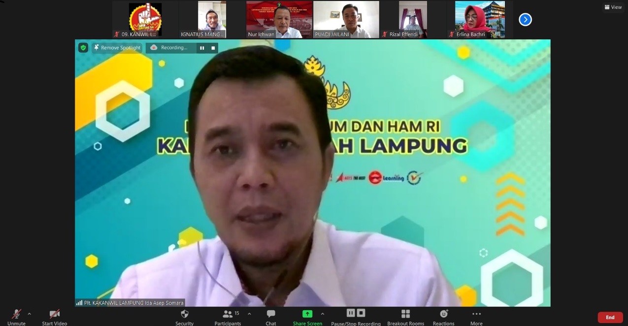 Bandar Lampung, etalaseinfo.com (SMSI) – Dalam rangka pembentukan Struktur Organisasi Majelis Pengawas Wilayah (MPW) Notaris Provinsi Lampung, Kantor Wilayah Kementerian Hukum dan Hak Asasi Manusia Lampung sebagai instansi Pembina memfasilitasi Rapat Internal secara Virtual Zoom Meeting. Rabu (21/07/2021)