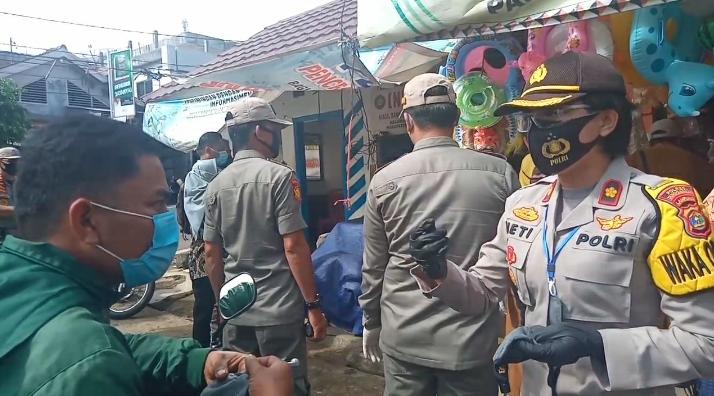 Selanjutnya, Kapolsek Pugung Ipda Okta Devi, SH. MH mendampingi Dandim 0424/Tanggamus Letkol Inf. Arman Aris Sallo membagikan masker di Pasar Babakan Kecamatan Pugung.