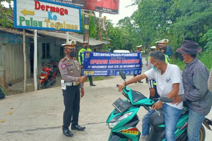 Pesawaran, etalaseinfo (SMSI) – Satuan Lalulintas (Satlantas) Polres Pesawaran melakukan giat Operasi Zebra Krakatau 2021 di Jalur Lintas Pantai Mutun Kecamatan Teluk Pandan Kabupaten Pesawaran, Minggu (21/11/21).