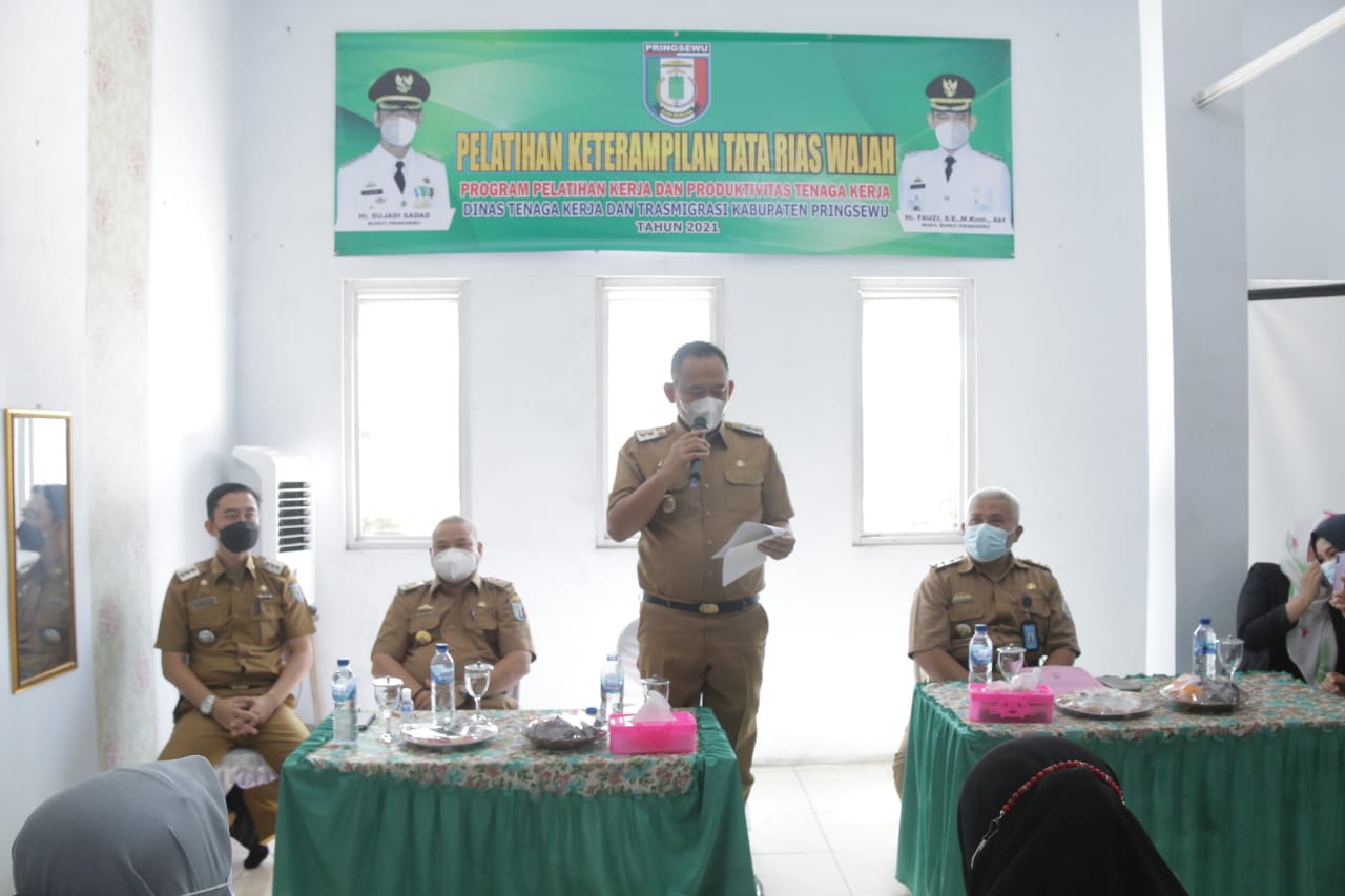 Wakil Bupati Pringsewu Dr.H.Fauzi, SE, M.Kom., Akt., CA, CMA didampingi Asisten Perekonomian dan Pembangunan Drs.Masykur Hasan, MM dan Camat Pringsewu Moudy Ary Nazolla, SSTP, MH dalam sambutannya mengapresiasi kegiatan pelatihan yang diselenggarakan oleh Dinas Tenaga Kerja dan Transmigrasi Kabupaten Pringsewu ini.