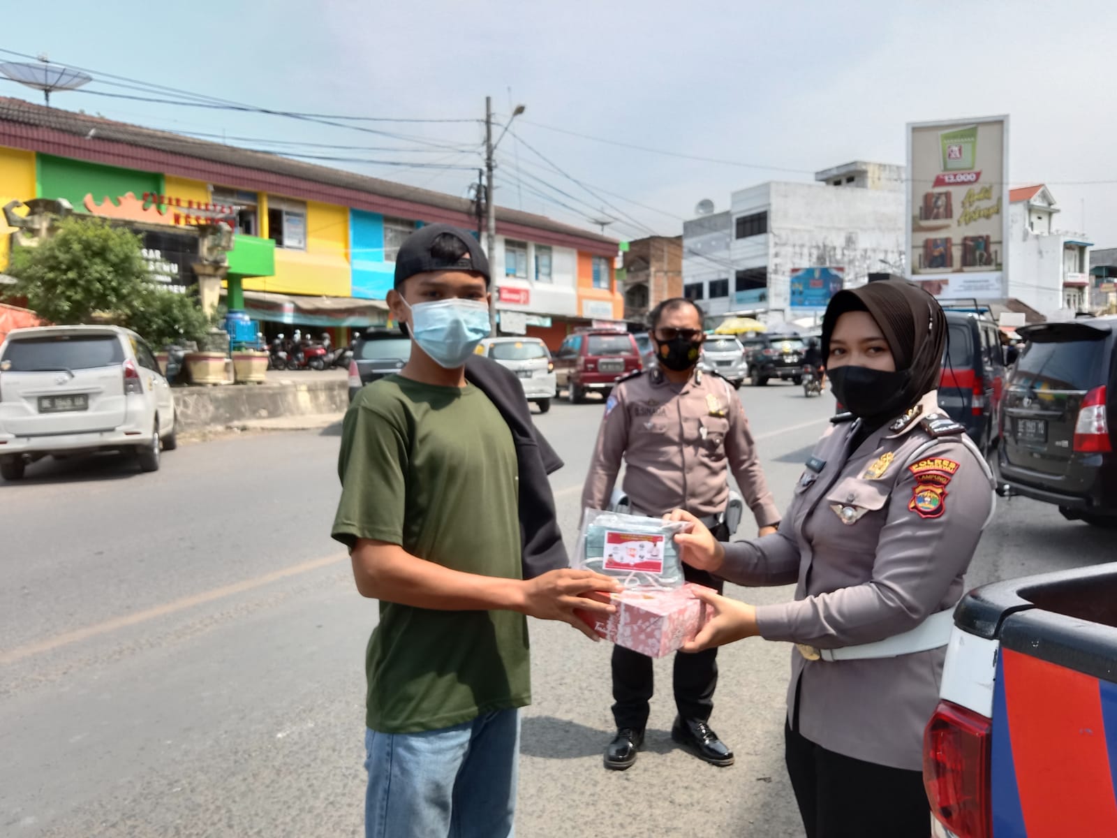 Polwan Polres Pringsewu Bagikan Nasi Kotak Dan Masker
