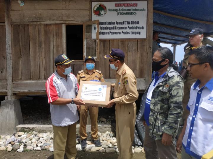Dalam kunjungannya Kepala Dinas Perindustrian dan Perdagangan Provinsi Lampung, Satria Alam didampingi Kabid PDN Zimmi Skil menyerahkan bantuan 1500 pcs masker ke Desa Pulau Legundi dan 1500 pcs masker ke Desa Hanura Kabupaten Pesawaran dalam rangka GEBRAK MASKER Provinsi Lampung.(Eva)