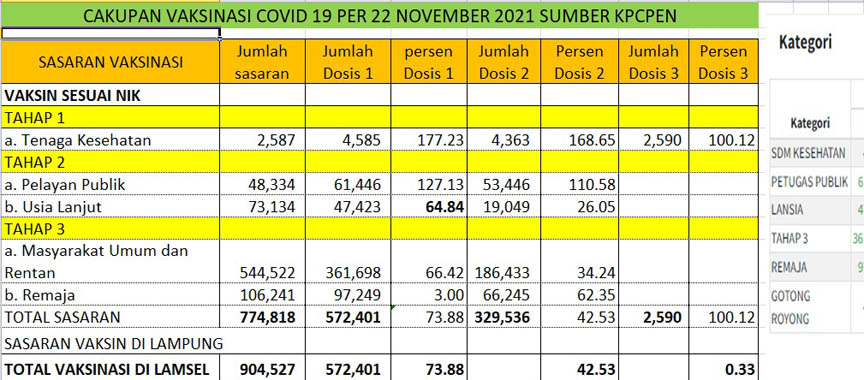 Hal itu diperkuat dengan data cakupan vaksinasi Covid-19 per tanggal 22 November 2021 yang bersumber dari KPCPEN, dimana vaksinasi Covid-19 dosis 1 untuk umum sudah mencapai 73,88℅. Sedangkan vaksinasi Covid-19 dosis 1 untuk lansia mencapai 64,84℅