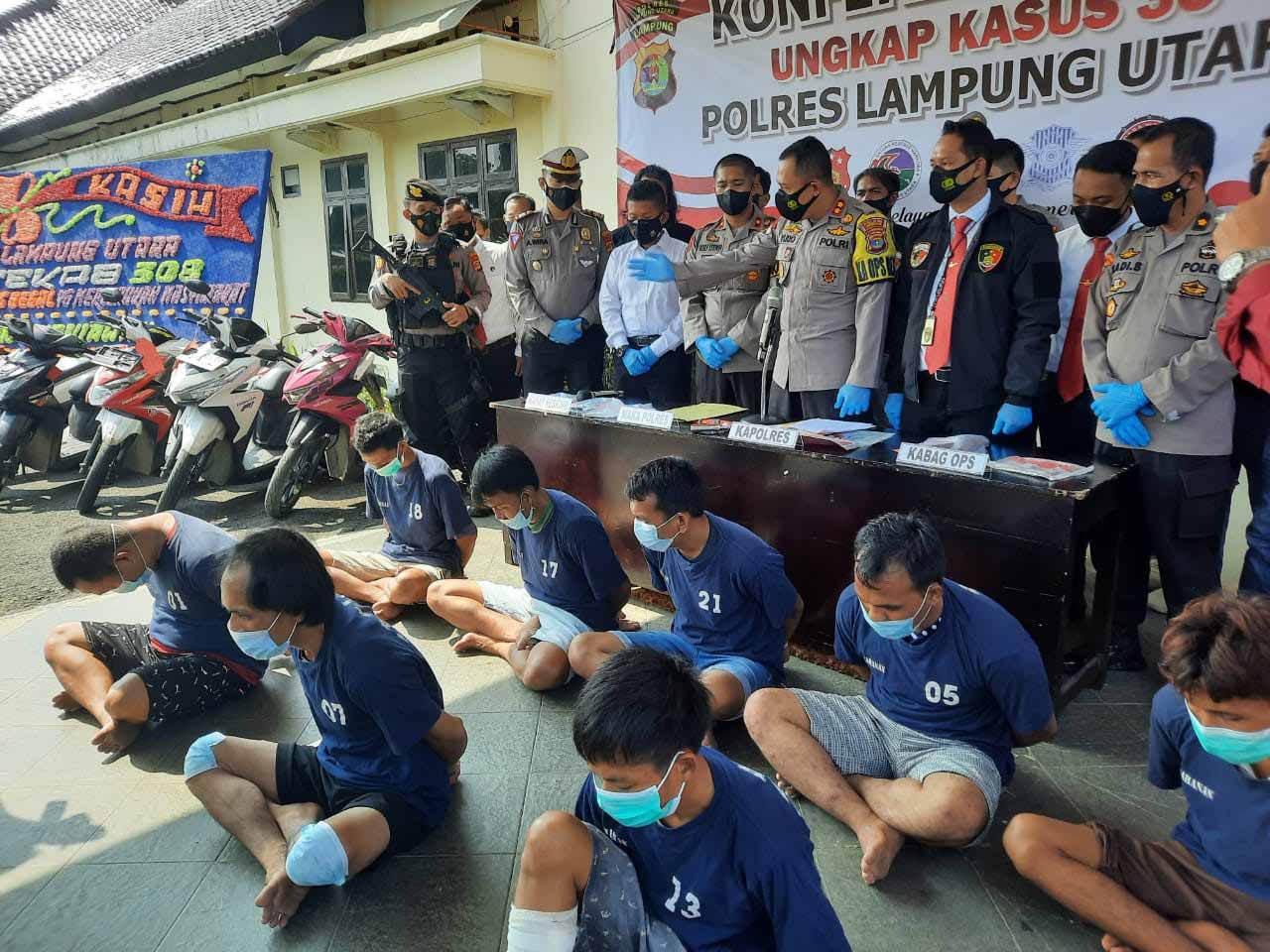 “Tersangka M (31) sudah melakukan aksi Curasmor (Begal) di 8 TKP diantaranya di Jalan Gg Merak 9B, Jl. Alamsyah RPN depan SMK Septi Jaya, Jl. Soekarno Hatta dpn RM Saung Nage, Jl Dusun 16 Tanjung Baru Desa Mulang Maya, Jl. Mangga Besar, Jl. Serma Peturun, Jalinsum Desa Kembang Tanjung dan Jalinsum Desa Kembang Tanjung,” kata Kapolres Lampung Utara, AKBP Bambang Yudho Martono, S.I.K., M.Si. didampingi PJU Polres Lampung Utara saat menggelar Konferensi Pers di Mapolres setempat, Senin (24/5/2021).