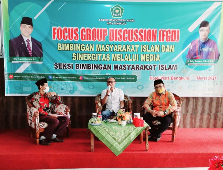 Mengusung tema “Bimbingan Masyarakat Islam dan Sinergitas Melalui Media”, Kepala Kemenag Kota Bengkulu Drs H Zainal Abidin MH melalui Kasi Bimbingan Masyarakat Islam H Rolly Gunawan S.Sos M.HI mengatakan, melalui FGD, dirinya berharap penyuluh agama dan KUA menjadi agen dakwah dalam menyebarluaskan informasi dunia Islam dan keagamaan. Rolly mengatakan, program-program Kementerian Agama harus disebarluaskan untuk memberikan pemahaman positif bagi masyarakat, serta untuk meminimalisir konflik sosial.