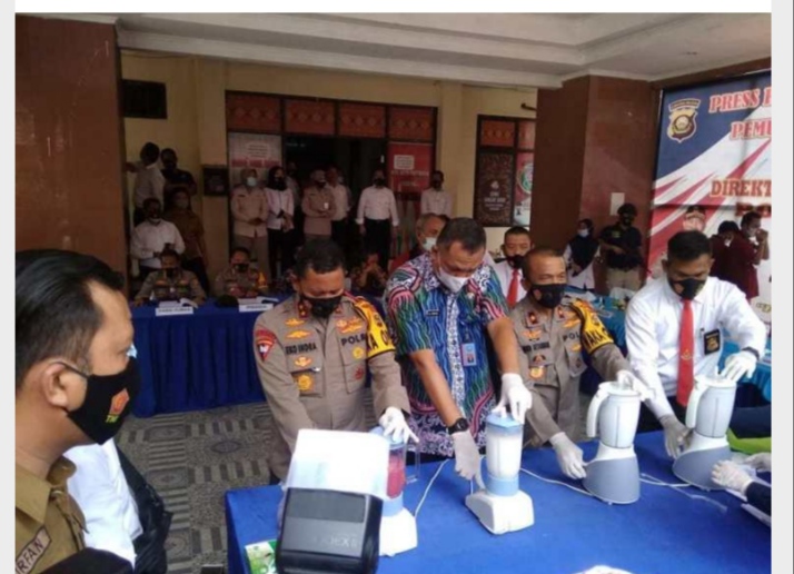 Pemusnahan Narkoba dipimpin langsung Kapolda Sumsel Irjen Pol Prof Dr Eko Indra Heri, S MM didampingi Wakapolda Sumsel Brigjen Pol Rudi Setiawan SIK SH MH. Terlihat barang bukti Narkoba dicampur air dan deterjen. Selanjutnya dimusnahkan dengan menggunakan blender lalu dibuang ke tempat pembuangan.
