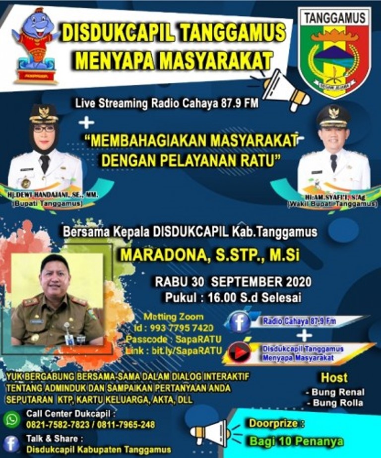 Kegiatan interaktif itu akan disiarkan langsung oleh Studio RADIO CAHAYA Kotaagung, juga disiarkan melalui, Live streaming Radio Cahaya 87,9 FM, Live Facebook Radio Cahaya 87,9 FM, Live Facebook Disdukcapil Kabupaten Tanggamus dan chanel YouTube Disdukcapil Tanggamus menyapa masyarakat.