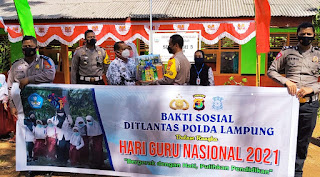 “Kita melaksanakan kegiatan bakti sosial dalam rangka memperingati hari guru nasional yang jatuh pada hari ini tanggal 25 November 2021, Direktorat lalu lintas memberikan bantuan ini sebagai bentuk kepedulian terhadap para guru yang berada di daerah terpencil di sini, yaitu di pulau Harimau yang ada di Kecamatan Ketapang Kabupaten Lampung Selatan” terang Wadirlantas saat ditemui awak media di lokasi kegiatan.