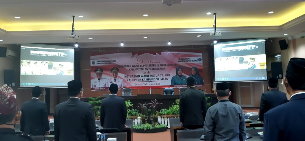 KALIANDA, etalaseinfo.com (SMSI) – Sekretaris Daerah (Sekda) Kabupaten bersama jajaran Forum Komunikasi Pimpinan Daerah (Forkopimda) Lampung Selatan menyaksikan pelantikan Bupati dan Wakil Bupati Lampung Selatan secara virtual dari Aula Rajabasa, kantor bupati setempat, Jumat (26/2/2021).