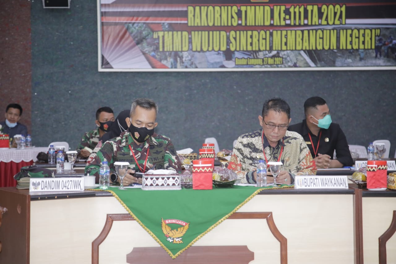 Way Kanan, etalaseinfo.com (SMSI) – Wakil Bupati Way Kanan, Drs. Ali Rahman M.T bersama unsur dari Bappeda dan Dinas PMK Menghadiri Rapat Koordinasi Teknis TNI Manunggal Membangun Desa (TMMD) Ke-111 Komando Resor Militer (Korem) 043/Garuda Hitam, di Gedung A. Yani Makorem 043/Gatam Jl. Teuku Umar No.85, Penengahan, Kec. Tj. Karang Pusat, Kota Bandar Lampung, Kamis (27/05/2021)