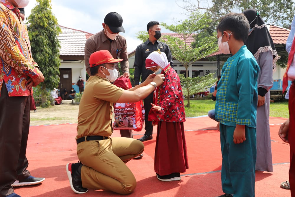 Penyerahan seragam tersebut dilakukan secara simbolis oleh Bupati Lambar Parosil Mabsus dan Ketua DPRD Lambar Edi Novial, kepada siswa-siswi peserta didik baru dari tingkat SD/MI dan SMP/MTs tahun pelajaran 2021/2022 yang dipusatkan di SMPN 1 Gedung Surian.