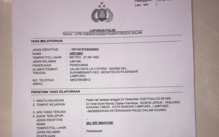 “Ibu Sri Wahyuni telah memberikan keterangan palsu di bawah sumpah pada saat sidang Laporan Pelanggaran TSM di Bawaslu Lampung,” ujar Untung seperti dilansir Kantor Berita RMOLLampung.