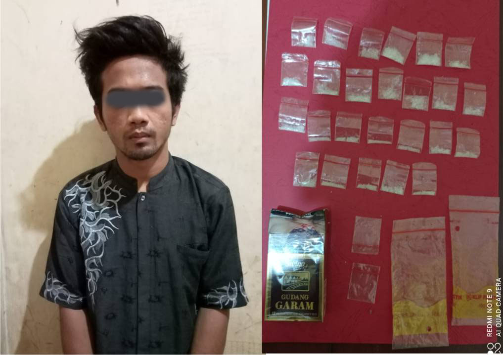 Pada saat petugas melakukan penggeledahan badan tersangka, pada saku celana sebelah kiri bagian depan ditemukan bekas bungkus rokok merek Gudang agaram Surya 12 yang berisikan 25 bungkus plastik klip bening berisikan kristal warna putih diduga shabu.