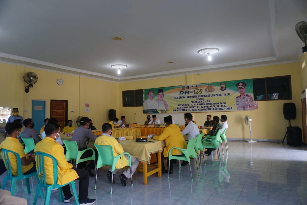 Lampung (Bumi1.com) Dandim 0429/Lamtim Letkol Kav. Muhammad Darwis bersama Kapolres Lampung Timur AKBP. Wawan Setiawan, S.IK berkunjung ke Posko Pemenangan Nomor urut 3, Dawam Rahardjo Dan H Azwar Hadi untuk menyongsong Pemilihan Kepala Daerah (Pilkada) aman, sejuk, damai, dan sehat, Senin (28/09/2020).