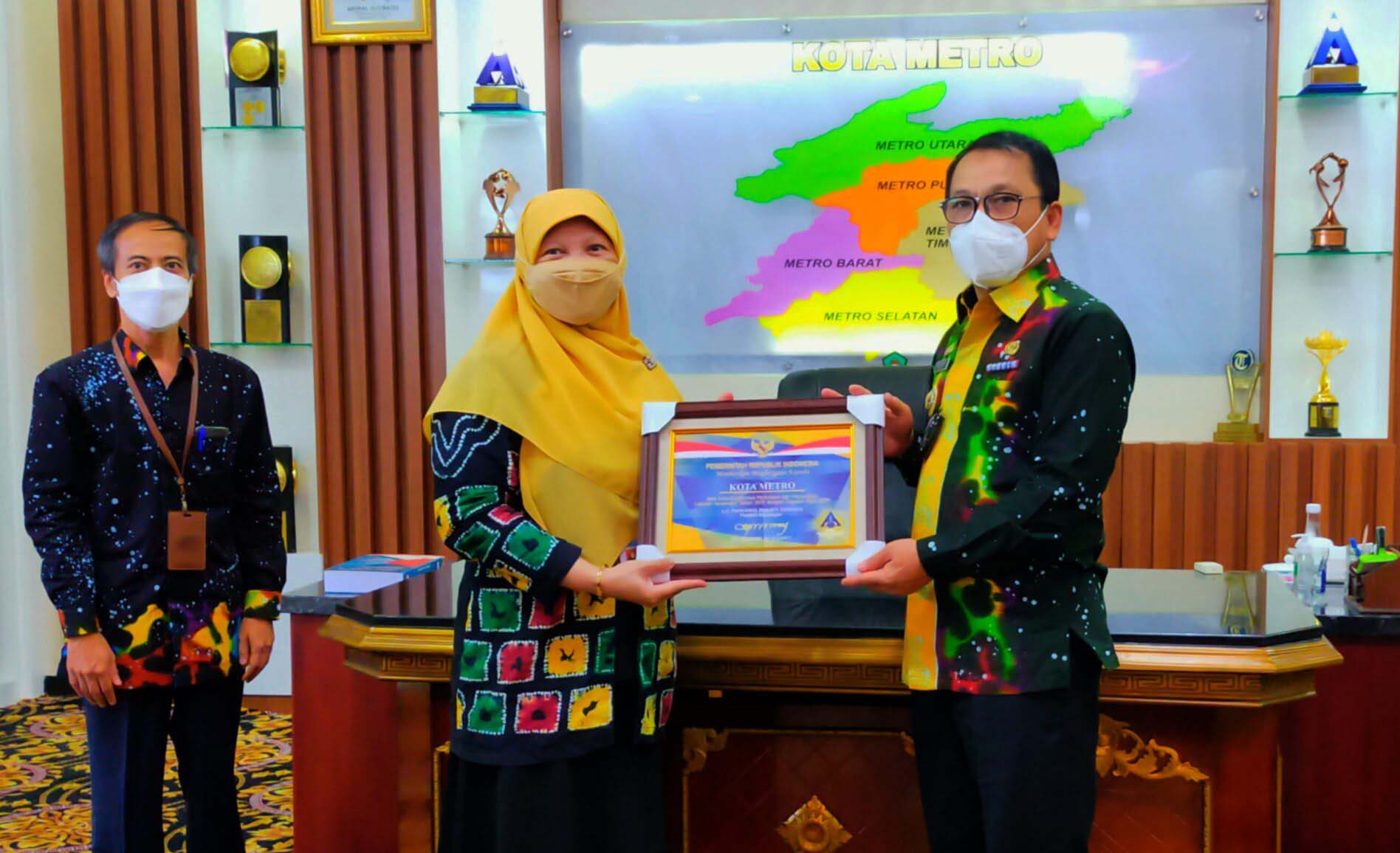 Walikota Metro Wahdi didampingi Sekretaris Daerah Kota Metro Bangkit Haryo Utomo menerima piagam Penghargaan dari Menteri Keuangan Republik Indonesia atas Keberhasilannya Menyusun dan Menyajikan Laporan Keuangan Tahun 2020 dengan Capaian Opini WTP.