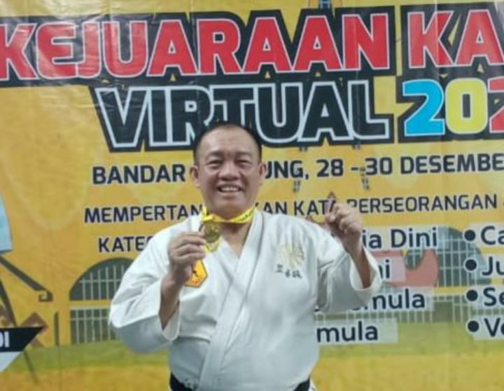 GR (Bandar Lampung) – Ketua Umun Federasi Olahraga Karate-do Indonesia (Forki) Provinsi Lampung Hannibal, berhasil merebuta juara pertama nomor kata perorangan veteran B. Pada Kejuaraan Karate Virtual, Senin (28/12/2020) siang di Gedung Sumpah Pemuda PKOR Way Halim Bandarlampung.
