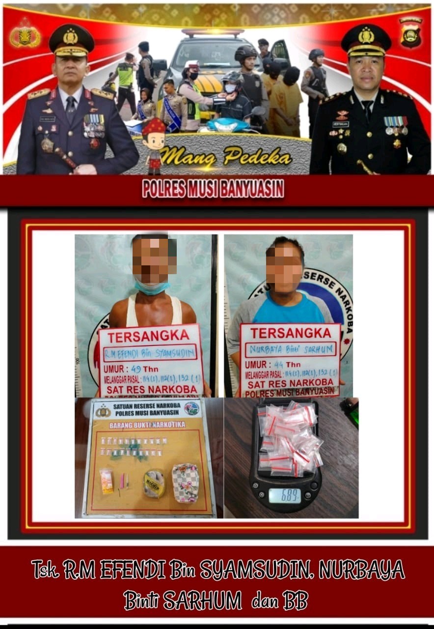 Siberindo.co- Peredaran Narkoba di tengah Pandemi Covid-19 masih terus beredar. Kali ini Suami-Istri asal Dusun II Desa Jirak Kecamatan Sungai Keruh Kabupaten Muba, Sumatera Selatan (Sumsel) diringkus dari kediamannya karena mengedarkan narkoba. Polisi berhasil menyita barang bukti 21 paket yang diduga sabu seberat 6,89 gram.