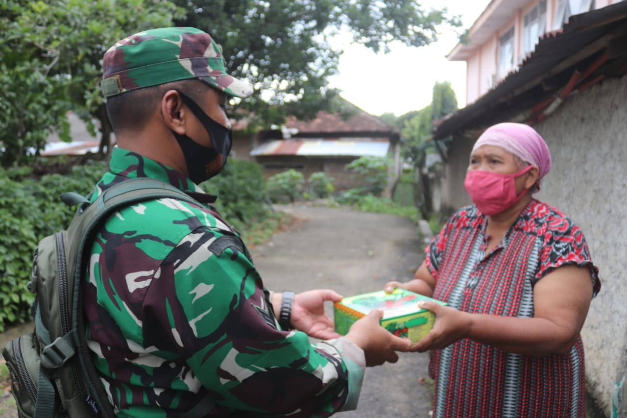 Koramil 410-06/Kedaton Kodim 0410/KBL membagikan nasi kotak dan masker secara gratis kepada warga yang membutuhkan di Jln. Bumi Manti Kelurahan Kampung Baru Kecamatan Labuhan Ratu, Kota Bandar Lampung. Jum’at (29/1/2021)